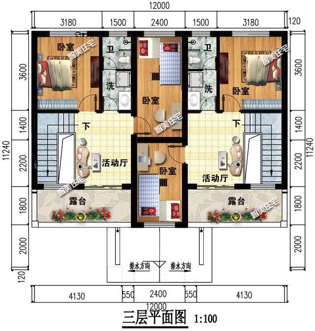 三層高度3.2米,布局為4臥室,2衛(wèi),活動(dòng)廳,露臺(tái)。