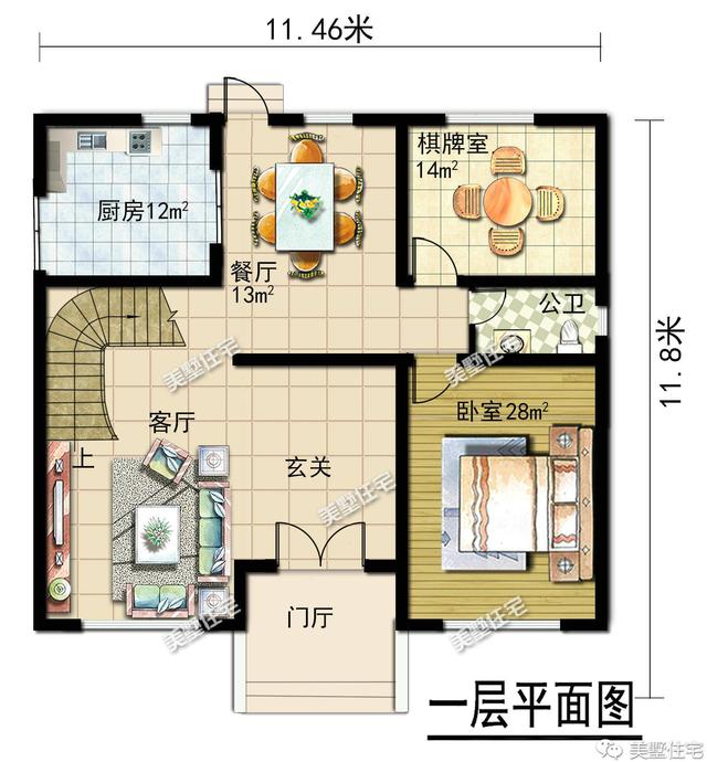 一層:玄關(guān)、客廳、臥室、公衛(wèi)、廚房、餐廳、棋牌室