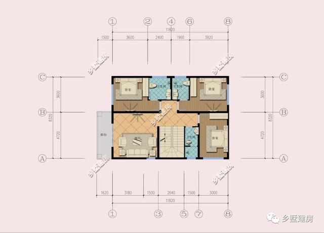 第二層平面圖:設(shè)有客廳,三臥室,三衛(wèi)生間。
