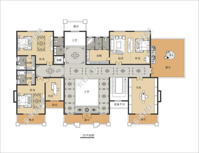 可通過電梯或者樓梯來到2層,2層空間寬敞舒適,有3間豪華臥室套房,1間大書房;南北均有大露臺;