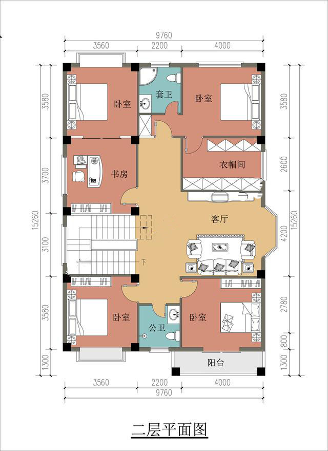 而二層設(shè)一個(gè)小客廳,方便平日起居;帶衣帽間和套衛(wèi)的主臥,打造高品質(zhì)生活;另外設(shè)三臥室和一書(shū)房滿足平日所需。