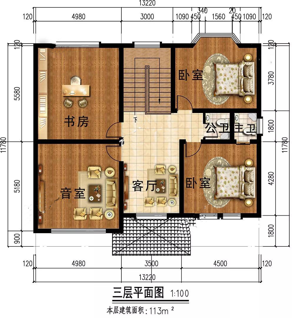 三層:客廳溫馨,方便家人在此洽談聊天,增進(jìn)感情;2個(gè)臥室,居住有余,可做客房接待親友;設(shè)影音室,方便家人在此休閑娛樂(lè),放松心情