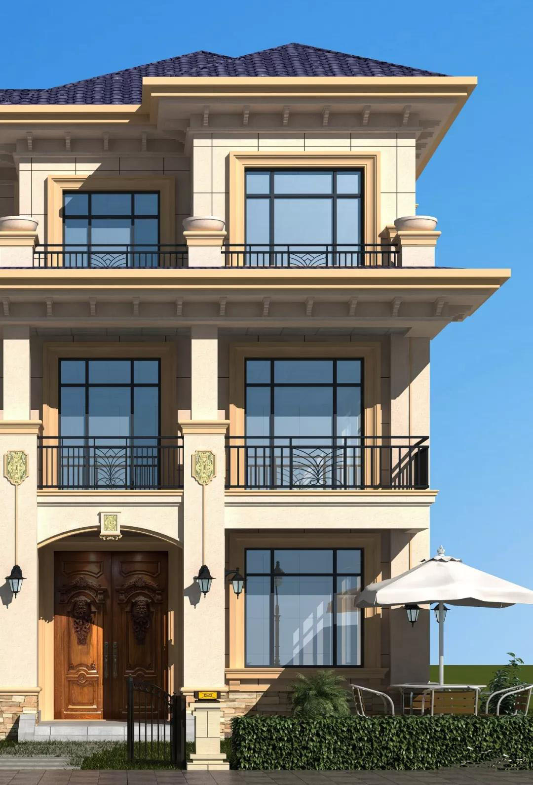 別墅屋頂是藍色西班牙瓦,外墻采用米黃色真石漆裝飾,多窗多露臺,別墅大氣,精美明亮。