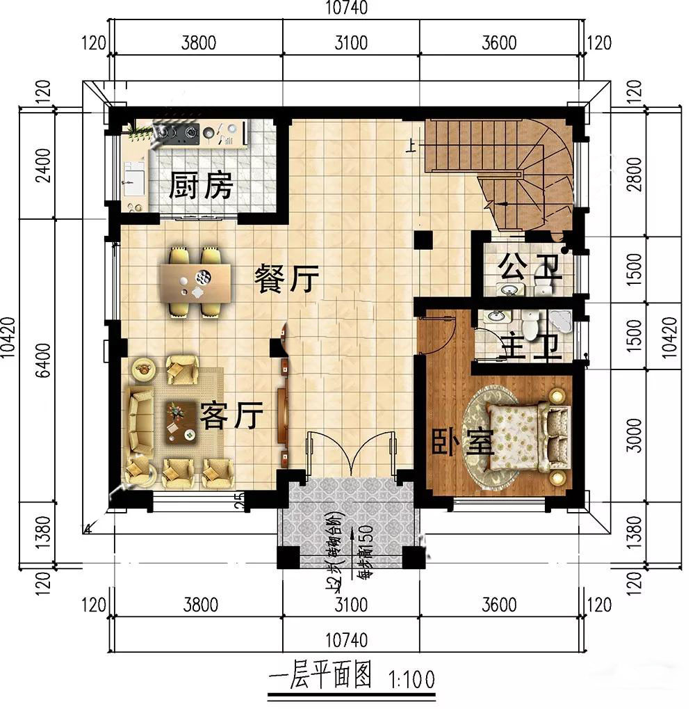 一層:入戶門廳寬闊,餐廳客廳連通,用餐氛圍愉快;臥室?guī)в袃?nèi)衛(wèi),給老人居住,方便起居。