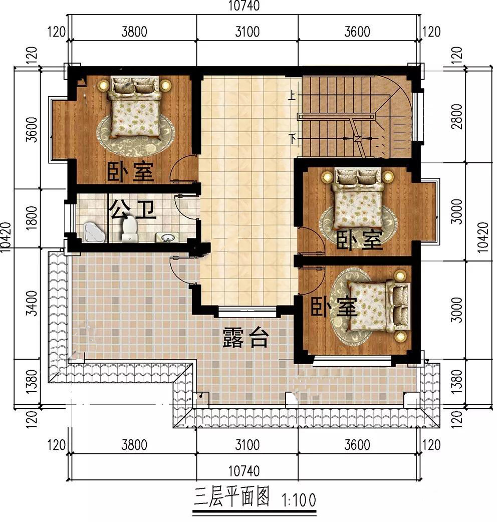 三層:3個臥室,滿足家人居住需求;大大的露臺,可以打造成空中花園,方便家人休閑娛樂,賞花觀景,陶冶情操。